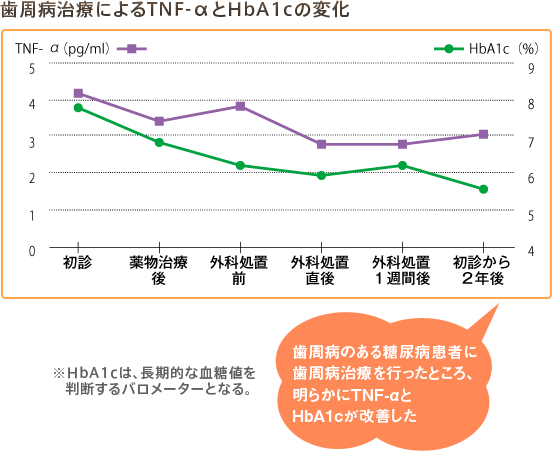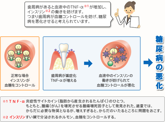 歯周病が糖尿病を悪化させることから、歯周病を治療することでTNF-αが抑えられ、インスリンの働きが活発になり、血糖コントロールが改善されることになります。