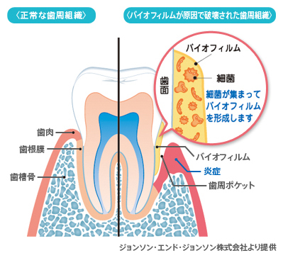 歯と歯肉の境目についた汚れ(歯垢=細菌プラーク)が歯と歯肉の間に入り込み、バイオフィルムを作って強い毒素を出し、歯肉を攻撃します。