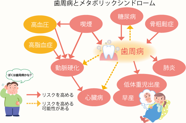 歯周病は、糖尿病や動脈硬化など、メタボリックシンドロームと関係のある病気とお互いに影響しあっていることがわかっています。